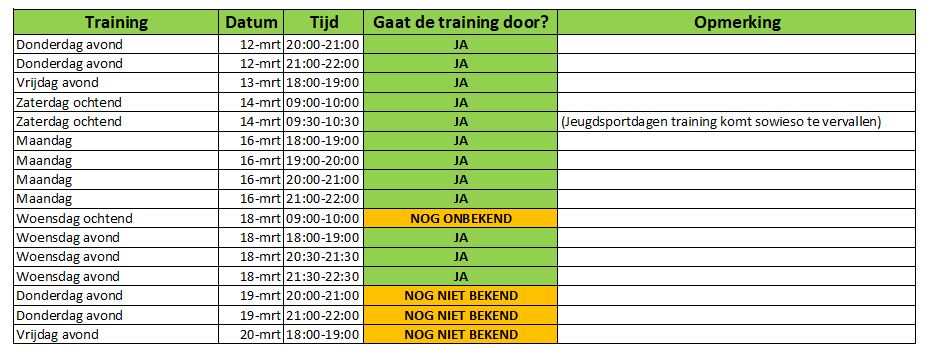Hieronder een overzicht of de training doorgaat of niet.