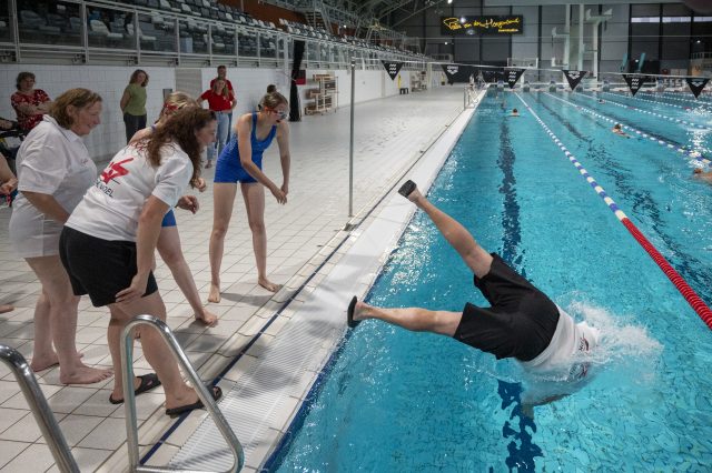 Eén voor één doken ze het 50-meterbad in. De eerste uitdaging diende zich al snel aan: het water was ruim twee graden kouder dan ze gewend waren in het Budelse zwembad! Maar dat hield niemand tegen. Iedereen zwom vol overtuiging zijn of haar favoriete slag naar de overkant, draaide om bij de muur en kwam weer terug, soms met een flinke glimlach en een stevige eindsprint. Terwijl de één rustig en geconcentreerd zwom, ging de ander veel enthousiasme te water, de ouders mochten aan de kant meekijken en genoten zeker zoveel als de zwemmers.